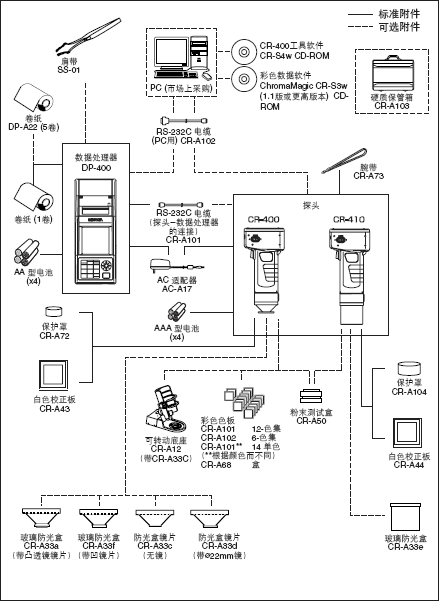 另售配件 硬盒CR-A103、RS-232C線纜CR-A102(連接PC)、粉體單元CR-A50、CR-400實(shí)用軟件CR-S4w、色彩管理軟件SpectraMagic NX CM-S100w、帶玻璃罩的遮光筒CR-A33a/f、CR-A33c/d遮光筒、測(cè)量頭托架CR-A12、彩色瓦片 硬盒CR-A103、RS-232C線纜CR-A102(連接PC)、粉體單元CR-A50、CR-400實(shí)用軟件CR-S4w、色彩管理軟件SpectraMagic NX CM-S100w、帶玻璃罩的遮光筒CR-A33e