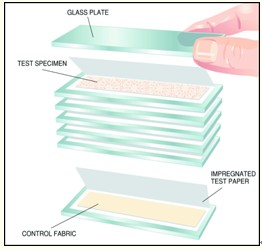 苯酚引起的泛黃可通過接觸實驗確定。過程是將一張實驗紙浸入包含石碳酸的甲醇溶液中。 測試紙沿軸線折迭,中間加入被測試的樣品,然后置于兩塊玻璃片之間。 標(biāo)準(zhǔn)的實驗組合包括5組測試樣品和一塊標(biāo)準(zhǔn)原樣,每一塊均被玻璃隔開,共需7塊玻璃。如果超過5塊樣本,需要增加附加的測試包。每個測試包裹在防BHT聚乙烯薄膜內(nèi)。用普通膠帶封住測試包。